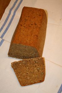 Brotteig: In der Schüssel verbleibt die größere Menge Sauerteig, die jetzt zum Backen benutzt wird. Hinzu gibt man ca. 2 kg Mehl, 1 Eßl. Salz und lauwarmes Wasser. Nur soviel, dass man einen gut knetbaren, halbfesten Teig erhält. Der Feuchtigkeitsgehalt ist relativ groß. Brotlaibe lassen sich daraus nicht formen ! Den Grund lesen Sie bitte unter „Brot backen, warum und wie“. Gründlich durchgeknetet, bleibt der Teig an warmem Ort 1 Stunde stehen. Danach knetet man noch mal sorgfältig und füllt ihn in zwei gefettete Keramikbackformen. Nach einer weiteren Geh-Zeit (lesen Sie bitte unter Vollkornbrot – Hintergründe), werden die Brote im E-Herd bei 120 Grad ca. 180 min (wenn es sich schwierig gestaltet, dann maximal bei 150 Grad ca. 120 min) gebacken und nach kurzer Abkühlzeit aus den Formen gekippt.